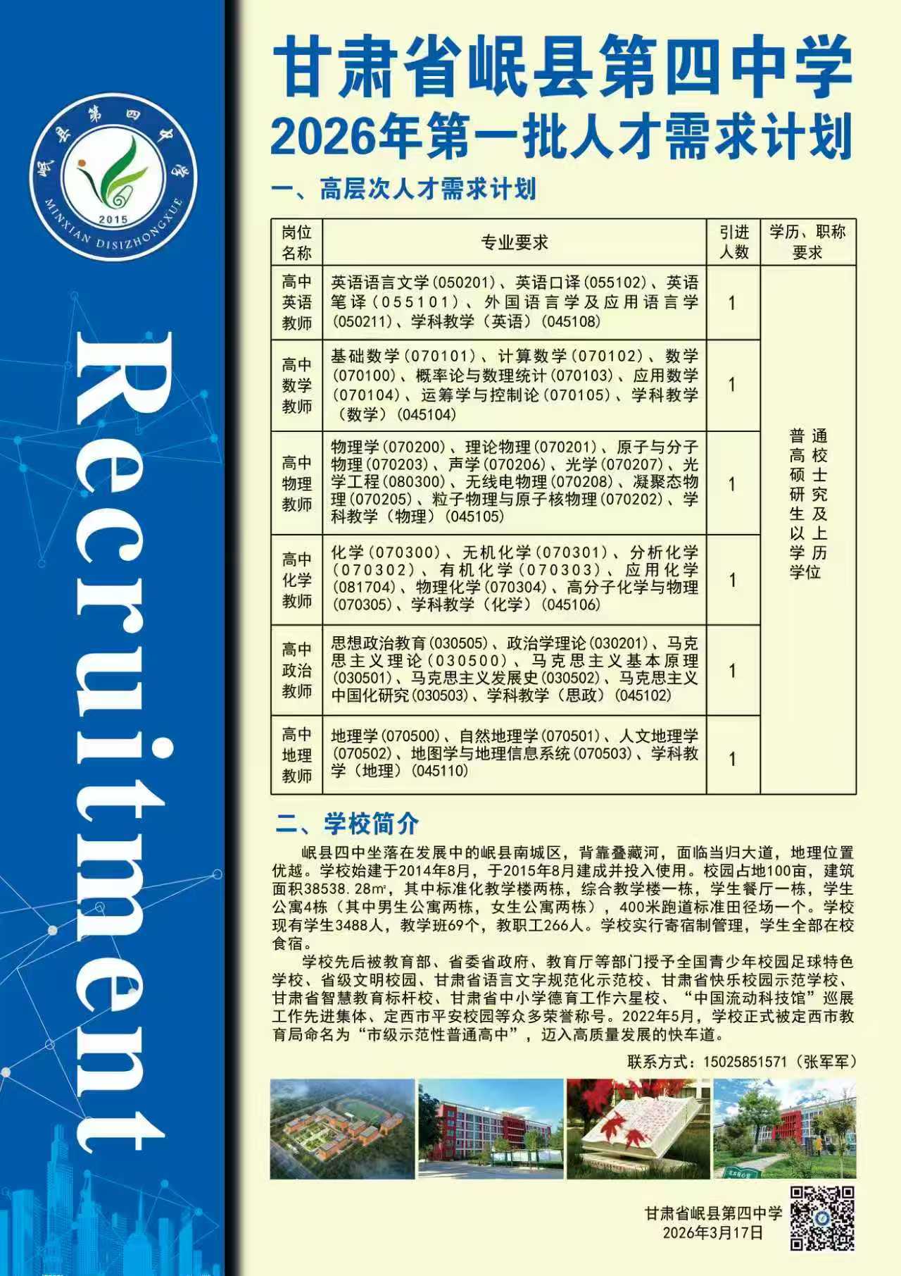 甘肃省岷县第四中学2026年第一批人才需求计划